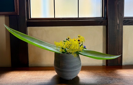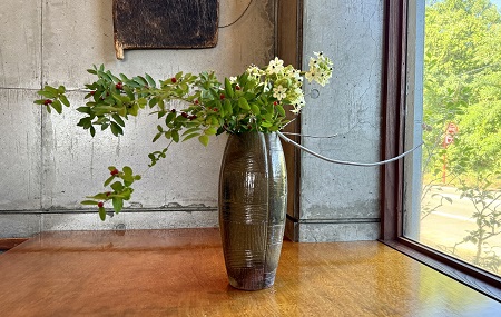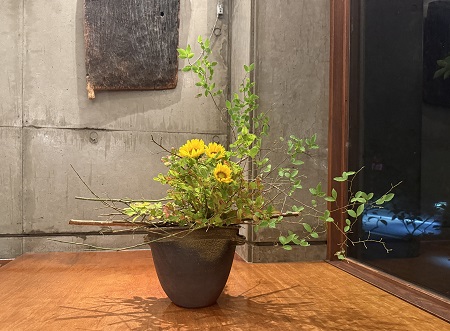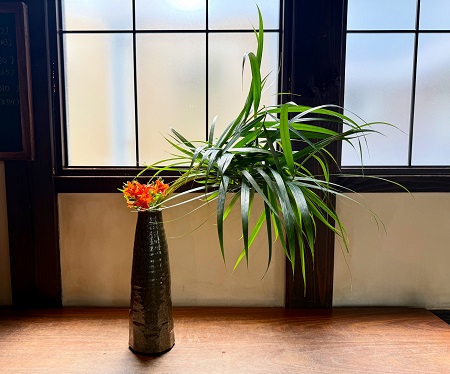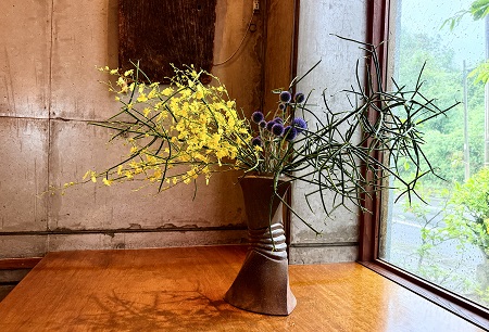 カウンターの生け花 2025.08.08 Works Revisited ・・・夏本番! 夏の赤をいける。 <アレカヤシ・ヒメユリ> <カークリゴ・オミナエシ・リンドウ・ルドベキア> 色々と暑い夏。瓢箪木の赤い実がかわいくて。 <オオヒョウタンボク・オオニソガラム・カレボク> ナツハゼの緑に魅せられる。 <ナツハゼ・ヒマワリ> <ミルクブッシュ・ルリダマアザミべッチーズブルー・オンシジューム> 暑すぎて、秋を待ちわびる。 <ンドウ・ゴムの木・着色割り竹>